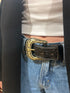 Hand tooling details at the start and end of the front panel. Black and white hide with black tooled leather and metal buckle