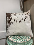Square cowhide and leather cushion. Includes insert, cowhide covers one side and on the reverse side is a gorgeous buttery soft leather.