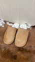 Tan and brown cow hide slippers. Inside of the slippers are wool for warmth. leather material underneath. Sheep skin insides.