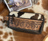 The main compartment provides ample storage for all your toiletry needs along with the outside zipper with tooled details for smaller necessities, a hand held tooled detailed strap stitched into the left end.