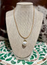16mm Spanish Pearl with an antique gold plated top, pendant on leather cord necklace with a gold plated magnetic clasp.