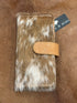 Tan iPhone 13 Plus, leather and cowhide phone case, clips to close, card holder and identification slots.