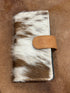 Tan iPhone 8 leather and cowhide phone case, clips to close, card holder and identification slots.