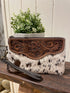 Tooled leather detailing, chocolate leather, internal pocket and card holder. 20cm (W) x 14cm (H). Available in black, tan, and brown!