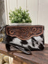 Tooled leather detailing, chocolate leather, internal pocket and card holder. 20cm (W) x 14cm (H). Available in black, tan, and brown!